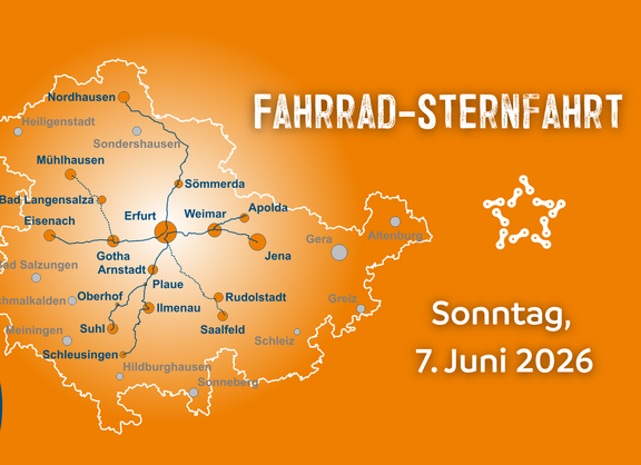 Für den 7.6.2026 plant der ADFC Thüringen seine erste Fahrrad-Sternfahrt. Gemeinsam radeln die Teilnehmenden aus ganz Thüringen nach Erfurt, um dort dem Thüringer Infrastrukturminister Steffen Schütz ein Forderungspapier zum Radverkehr zu übergeben.