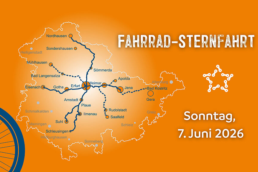 Der Allgemeine Deutsche Fahrrad-Club (ADFC) Thüringen will die Landesregierung öffentlichkeitswirksam auffordern, ihre selbst gesetzten Ziele zum Radverkehr ambitioniert anzugehen – und zugleich Menschen zum gemeinsamen Radfahren einladen. Für den 7. Juni 2026 plant der Verein daher eine Fahrrad-Sternfahrt nach Erfurt. Radfahrende aus möglichst vielen Thüringer Orten kommen an verschiedenen Treffpunkten zusammen und radeln schließlich auf vier Hauptrouten nach Erfurt. Am Zielort werden sie dem Thüringer Minister für Infrastruktur, Steffen Schütz, Vorschläge übergeben, mit denen spürbare Verbesserungen der Radverkehrsbedingungen in Thüringen erreicht werden können.