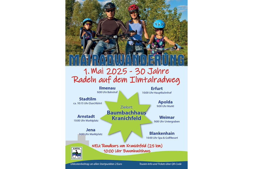 Am 1. Mai 2025 startet zum 27. Mal die Mairadwanderung mit dem Ziel Baumbachhaus in Kranichfeld. Unter dem Motto "Radeln auf dem Ilmtalradweg" werden Radfahrende aus Apolda, Arnstadt, Blankenhain, Erfurt, Ilmenau, Jena, Stadtilm und Weimar am Geburtshaus des Dichters Rudolf Baumbach erwartet. Ab 12 Uhr begrüßt der Förderverein Baumbachhaus Kranichfeld e.V. die Gäste, und es gibt ein buntes Programm mit der Burgen-Jazz-Band, der Tanzgruppe "Chaos Liner" Klettbach, Tao Te Weimarer Land e.V. Kranichfeld, Tombola, Fahrradakrobatik, Fahrradparcours, Flohmarkt und Infoständen. Die Ausstellung "Einkehr im Baumbachhaus" bietet Einblicke in Werke des Künstlers Felix Martin Furtwängler. Für das leibliche Wohl ist natürlich auch gesorgt.